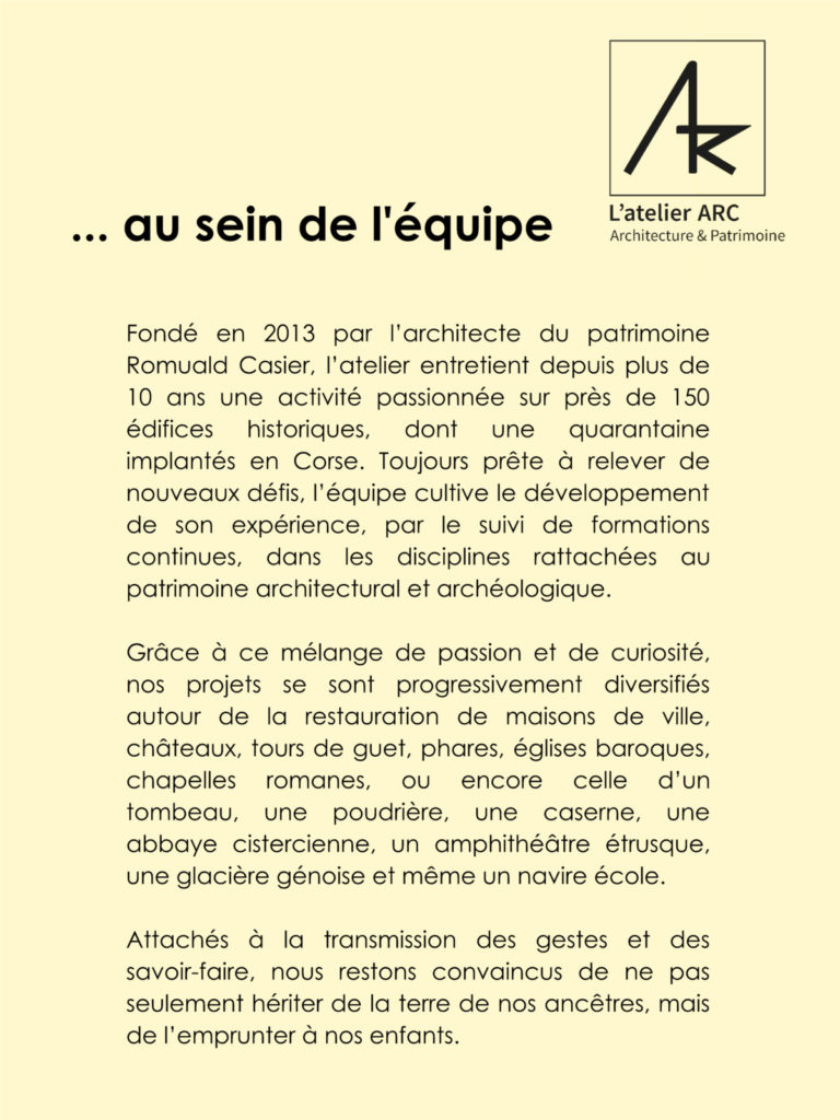 Fondé en 2013 par l’architecte du patrimoine Romuald Casier, l’atelier entretient depuis plus de 10 ans une activité passionnée sur près de 150 édifices historiques, dont une quarantaine implantés en Corse. Toujours prête à relever de nouveaux défis, l’équipe cultive le développement de son expérience, par le suivi de formations continues, dans les disciplines rattachées au patrimoine architectural et archéologique.