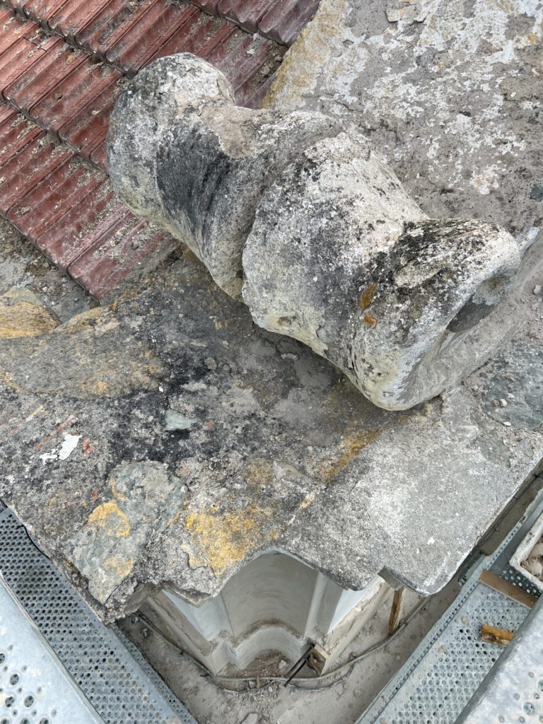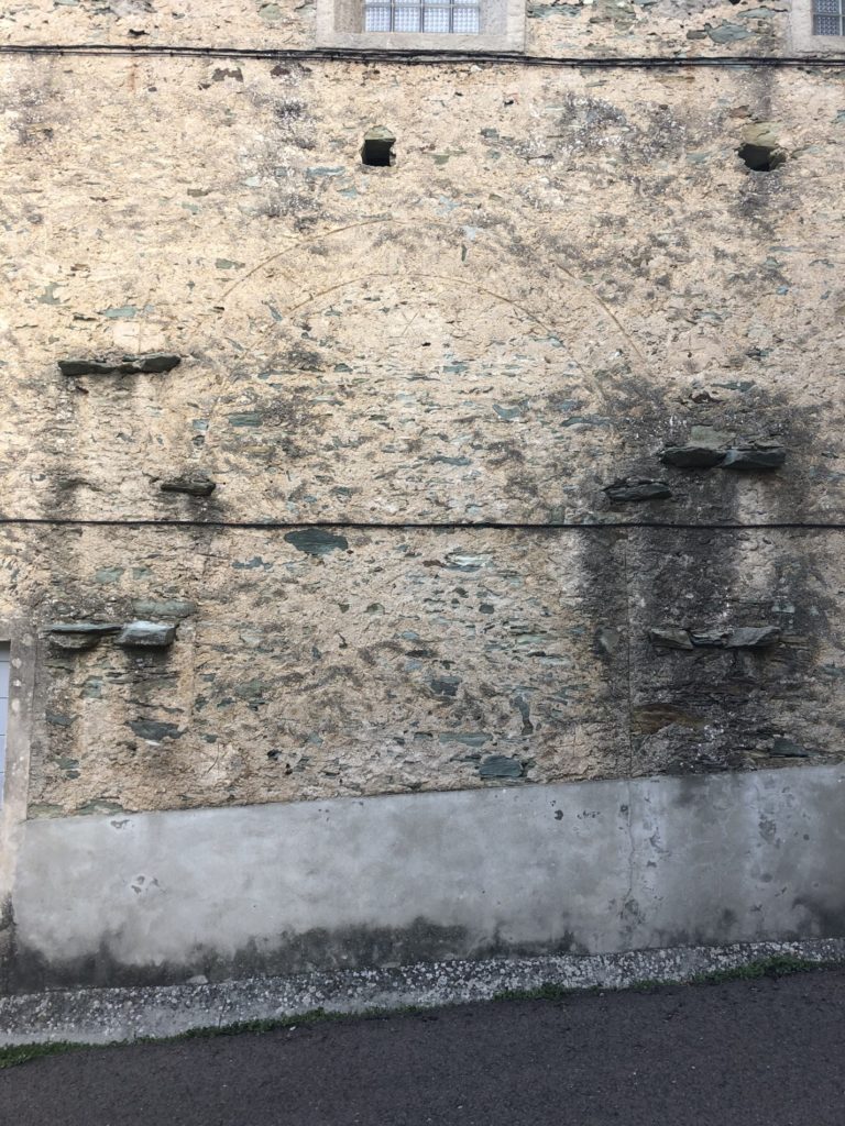 Avant d’engager la restauration, un diagnostic complet a été mené. Grâce à un relevé photogrammétrique réalisé par drone, en collaboration avec le géomètre-expert Quentin Burton, l’équipe a pu établir une documentation graphique précise de l’édifice. Ce travail a révélé plusieurs pathologies majeures : un enduit cimentaire non adapté, responsable de la dégradation des maçonneries en schiste ; une teinte jaune vif appliquée lors d’une restauration antérieure, en rupture avec la sobriété attendue pour un édifice de culte ; et des désordres généralisés sur les enduits et la couverture.