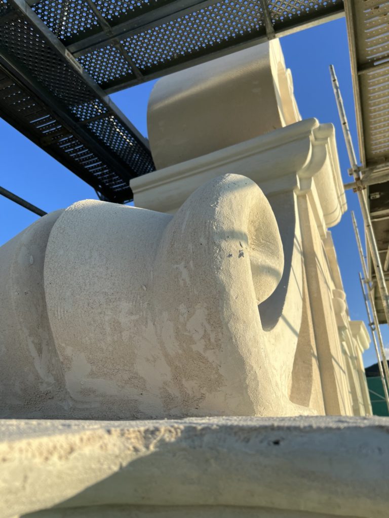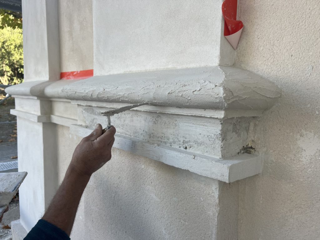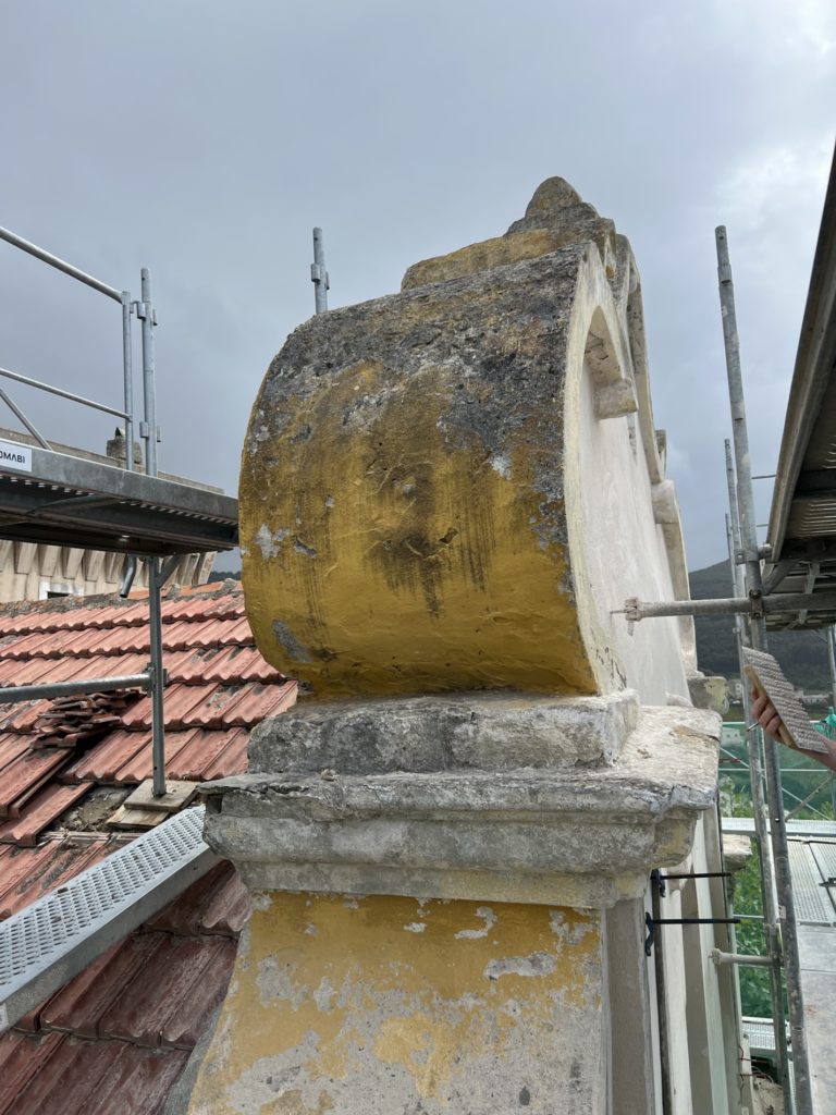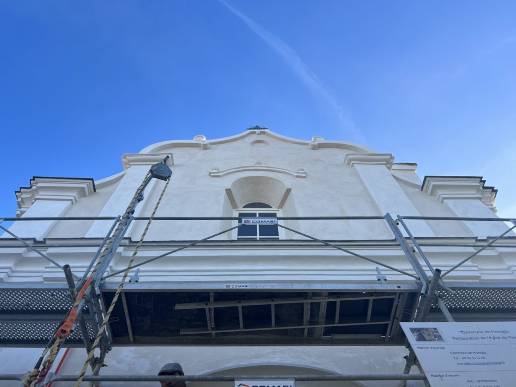 Une réflexion particulière a été portée sur la polychromie : les surfaces planes ont été restituées dans des tonalités sobres de blanc cassé, tandis que les niches et éléments rentrants ont reçu un badigeon coquille d’œuf, renforçant la lecture baroque de la façade.