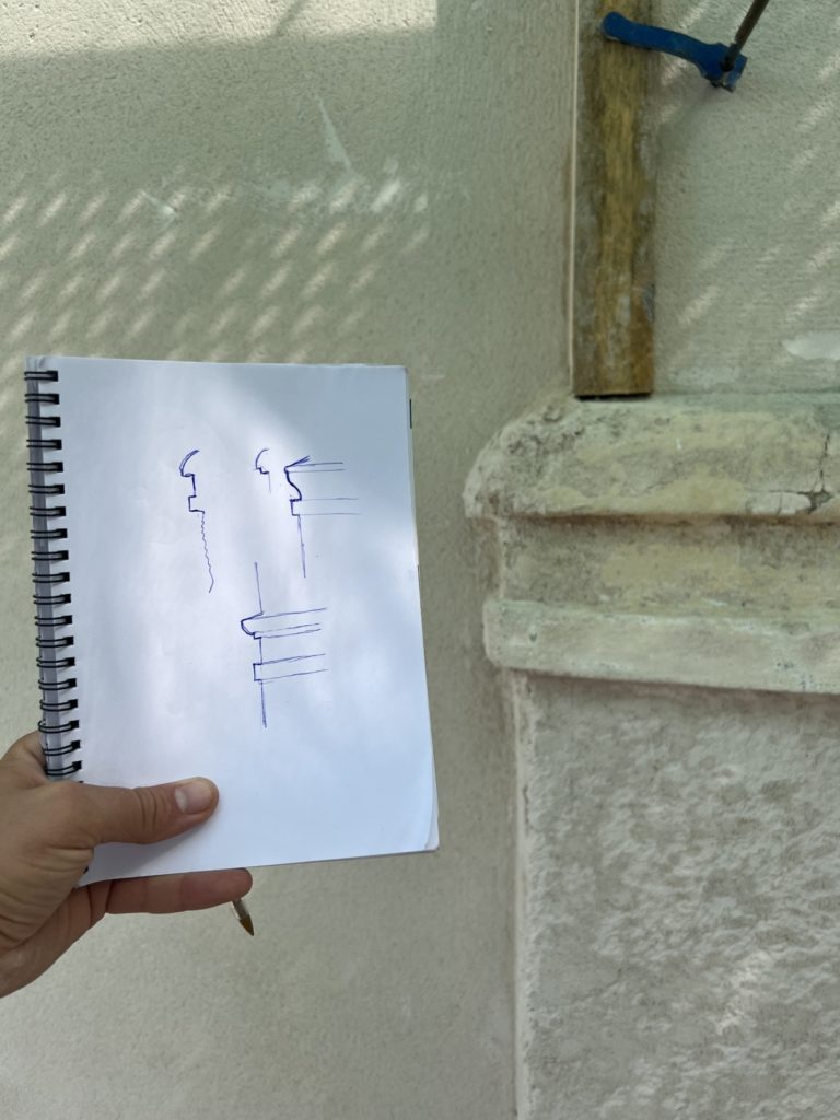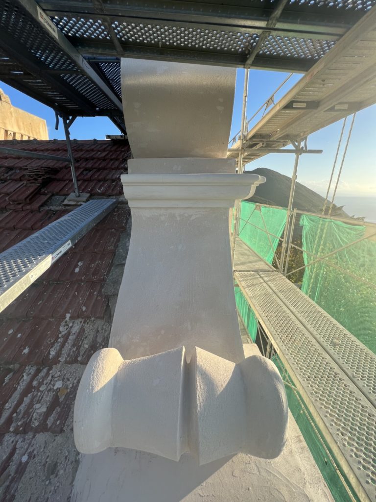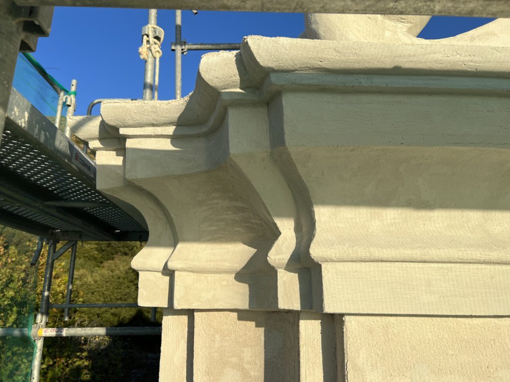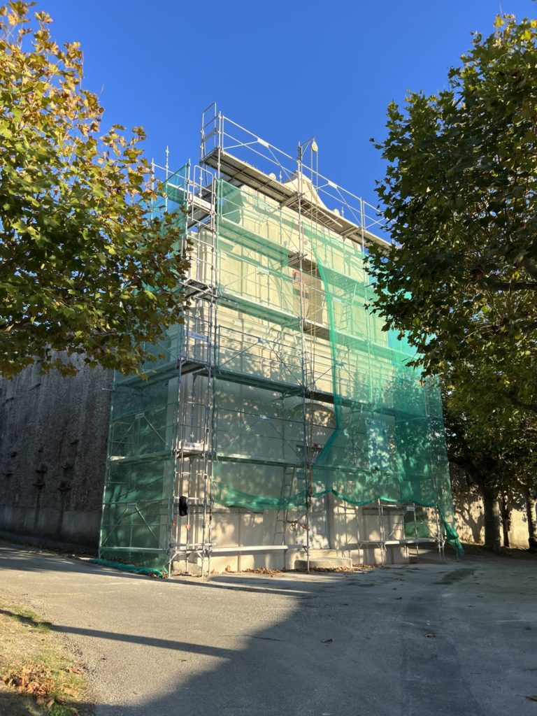 Une réflexion particulière a été portée sur la polychromie : les surfaces planes ont été restituées dans des tonalités sobres de blanc cassé, tandis que les niches et éléments rentrants ont reçu un badigeon coquille d’œuf, renforçant la lecture baroque de la façade.