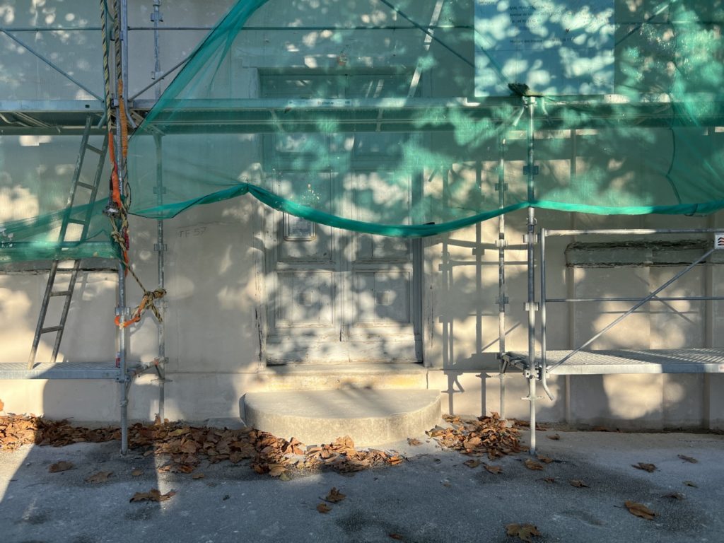 Le projet a également intégré le décapage et la remise en peinture de la porte d’entrée, ainsi que la création d’un parvis en ricciata accompagné d’un perron en gradins.