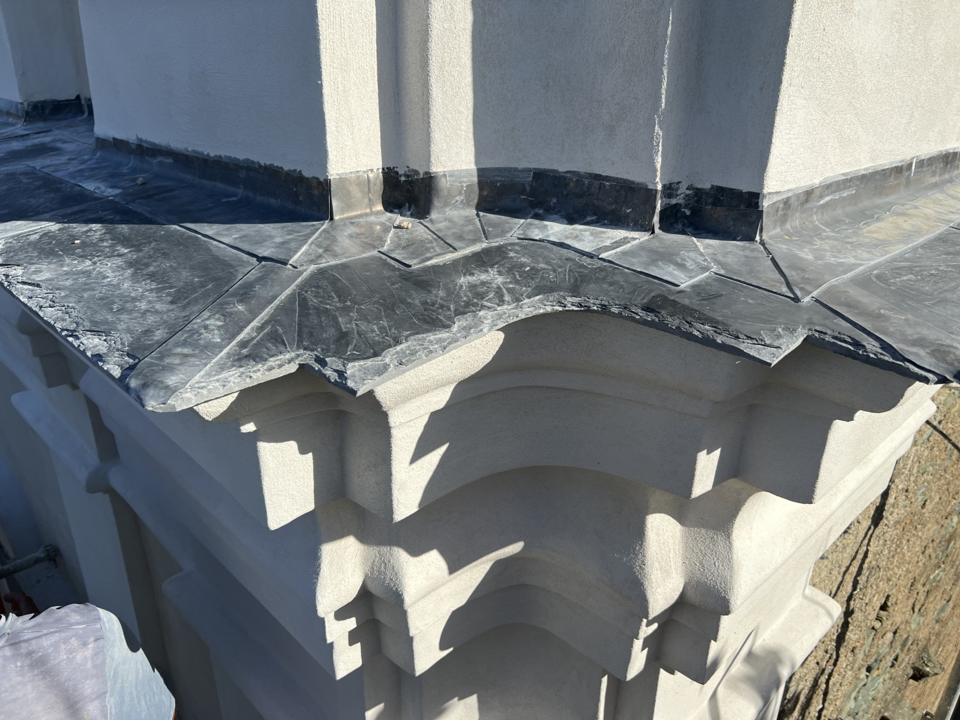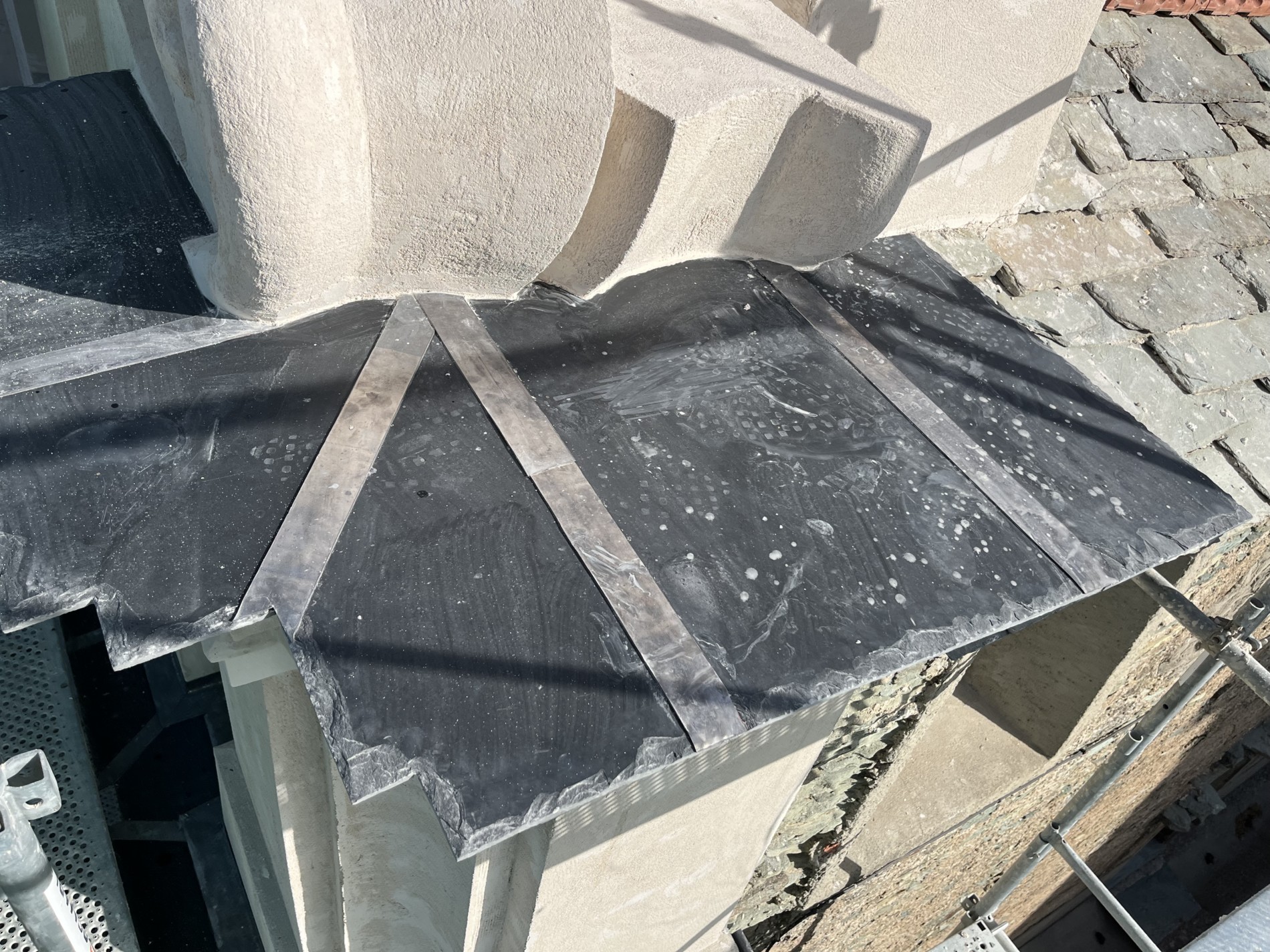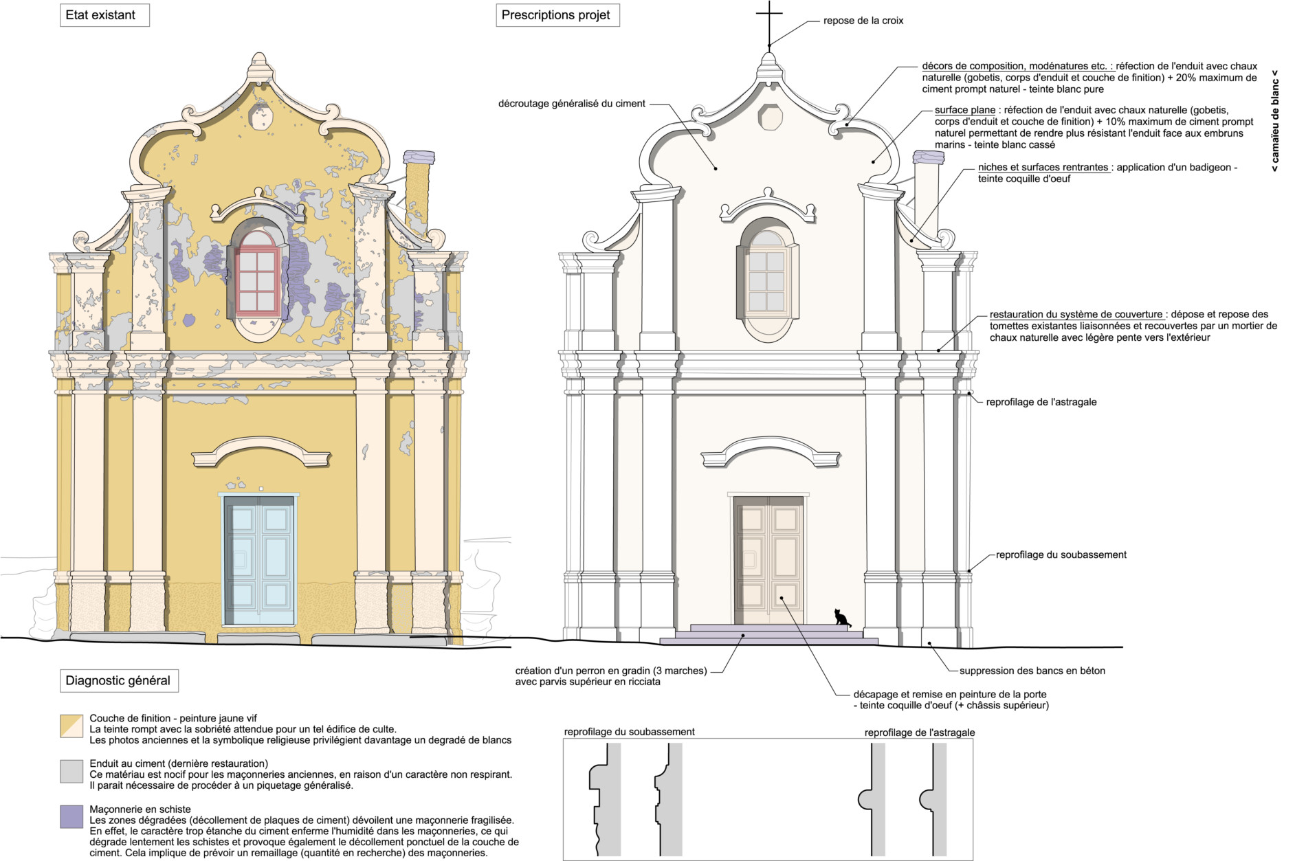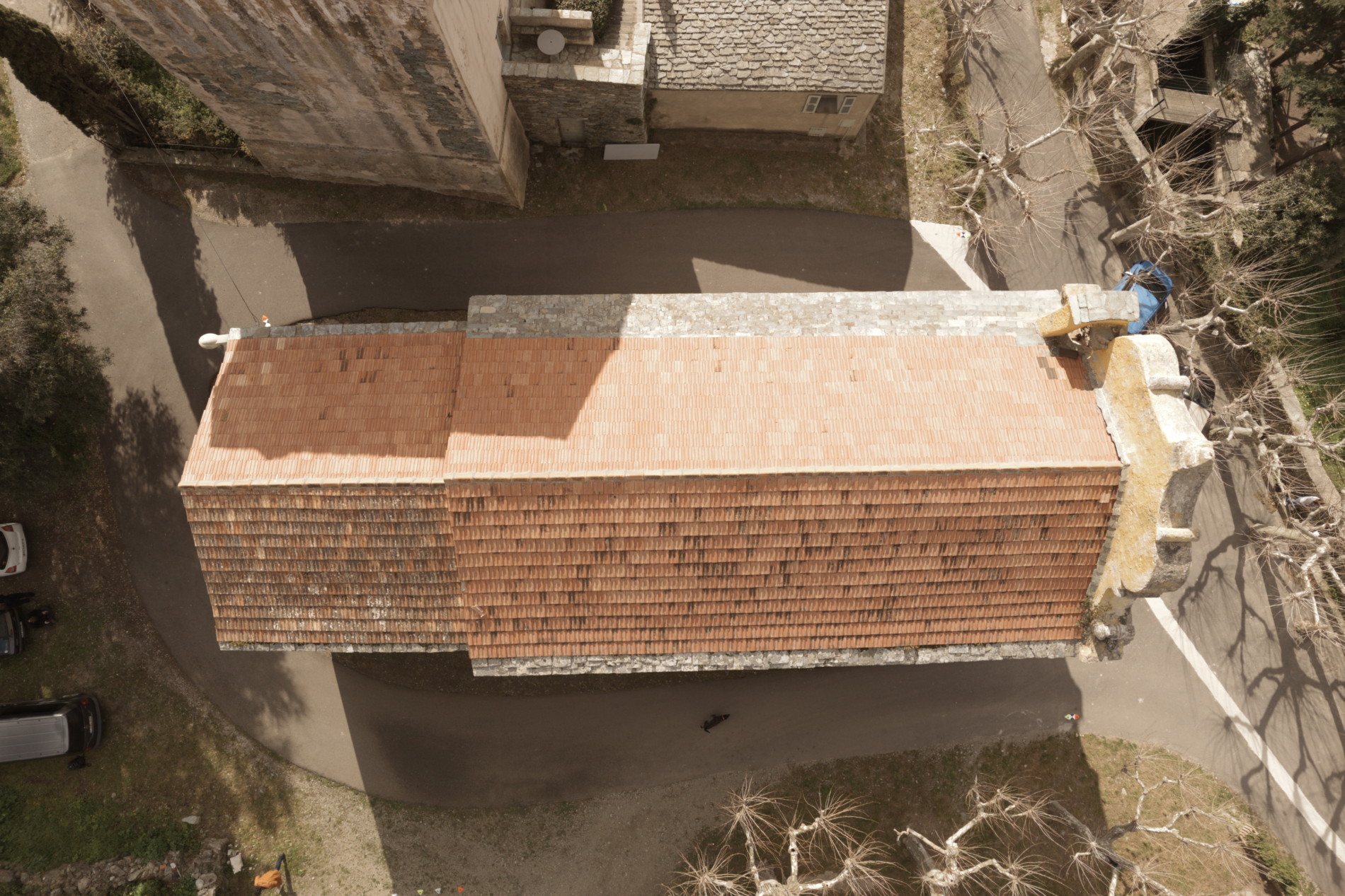 Avant d’engager la restauration, un diagnostic complet a été mené. Grâce à un relevé photogrammétrique réalisé par drone, en collaboration avec le géomètre-expert Quentin Burton, l’équipe a pu établir une documentation graphique précise de l’édifice. Ce travail a révélé plusieurs pathologies majeures : un enduit cimentaire non adapté, responsable de la dégradation des maçonneries en schiste ; une teinte jaune vif appliquée lors d’une restauration antérieure, en rupture avec la sobriété attendue pour un édifice de culte ; et des désordres généralisés sur les enduits et la couverture.