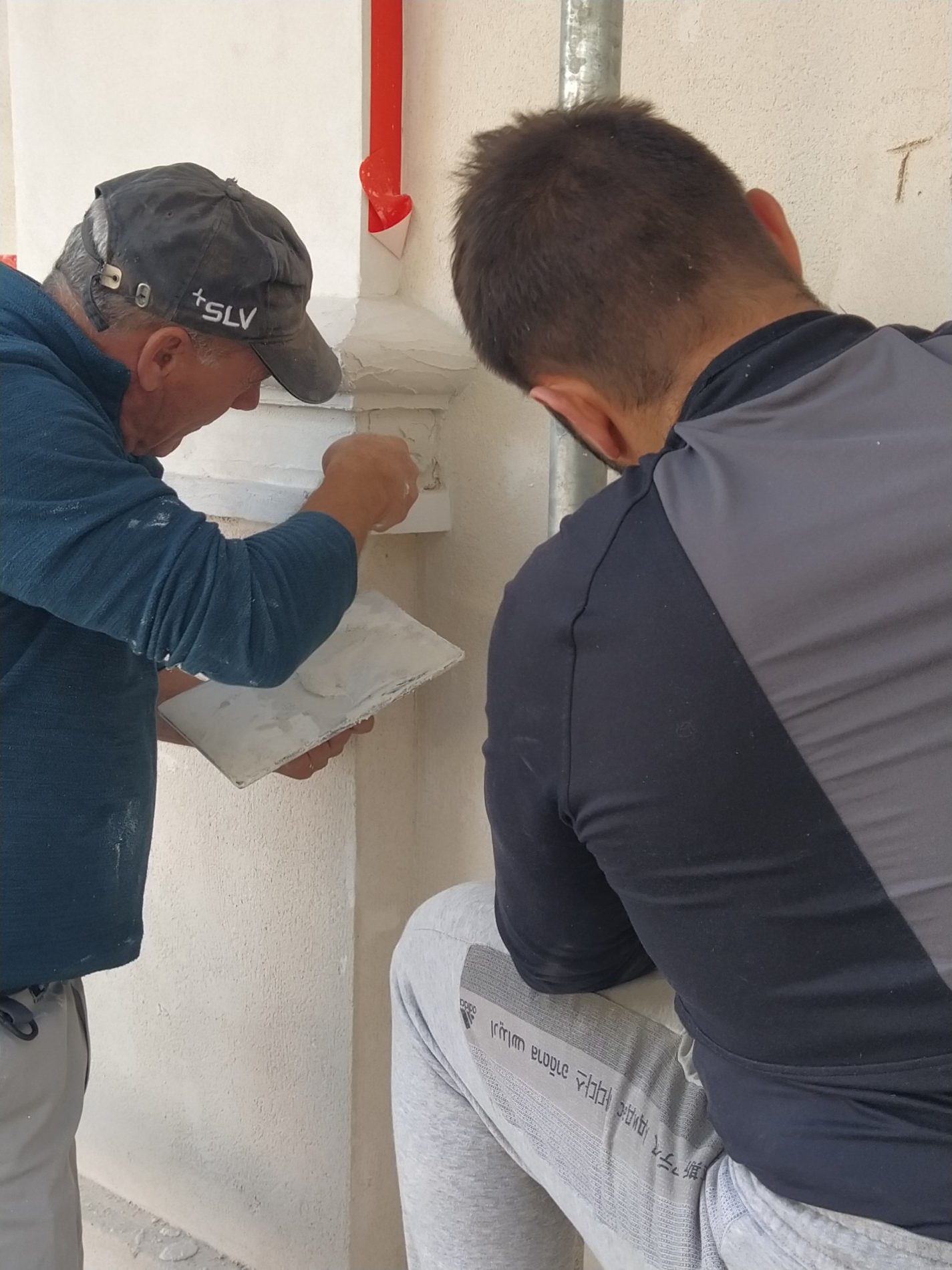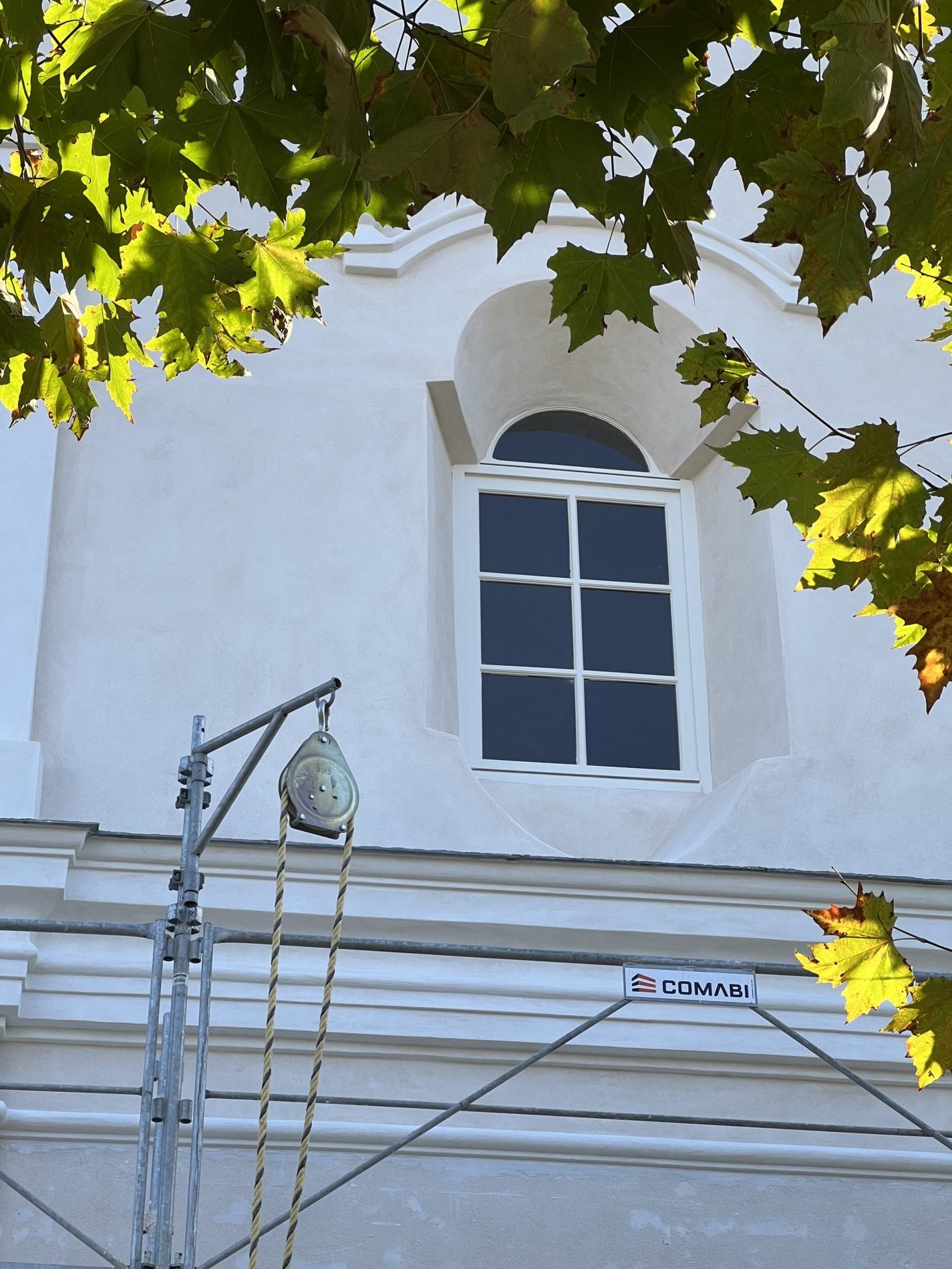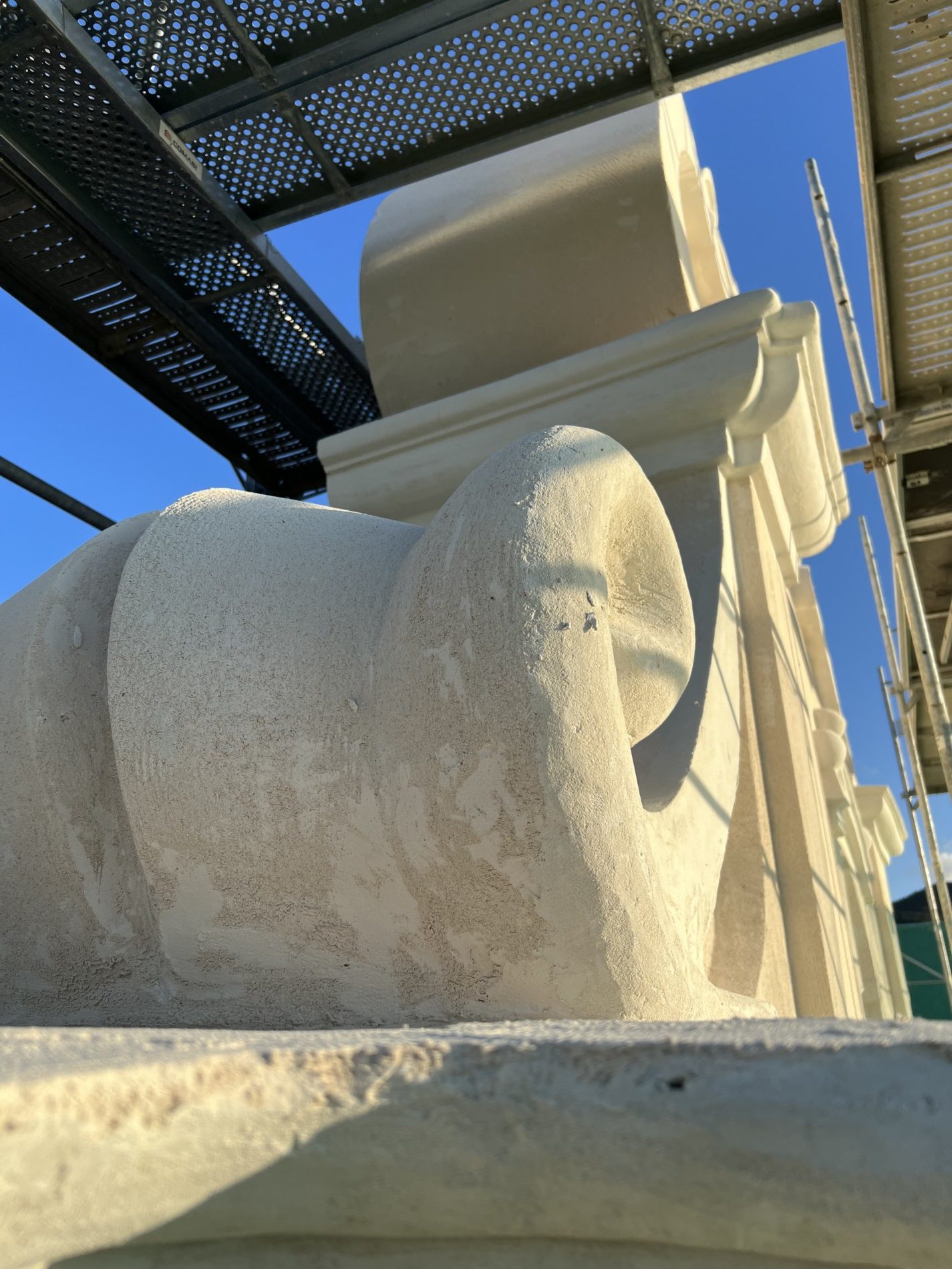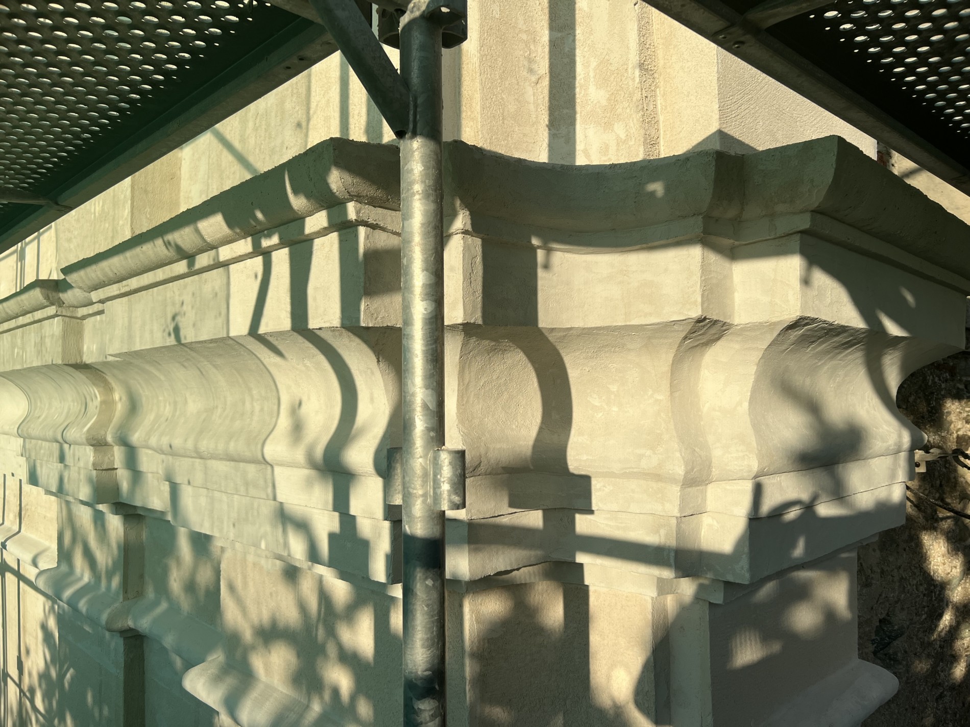 Une réflexion particulière a été portée sur la polychromie : les surfaces planes ont été restituées dans des tonalités sobres de blanc cassé, tandis que les niches et éléments rentrants ont reçu un badigeon coquille d’œuf, renforçant la lecture baroque de la façade.