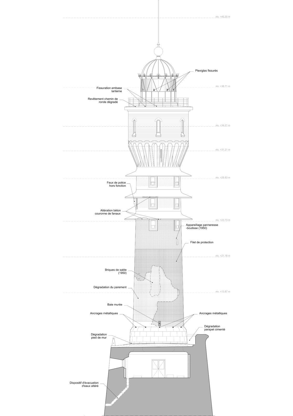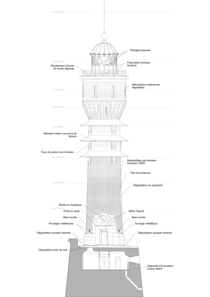 À l’extérieur, plusieurs pathologies majeures ont été relevées : décollement et hétérogénéité du parement de briques du fût, fissurations et éclatements des couronnes de fanaux en béton armé dus à la corrosion des armatures, altérations localisées du socle en béton désactivé, ainsi que dégradations importantes des dispositifs de couronnement (vitrages en plexiglas fissurés, pavés de verre endommagés, corrosion des éléments métalliques).