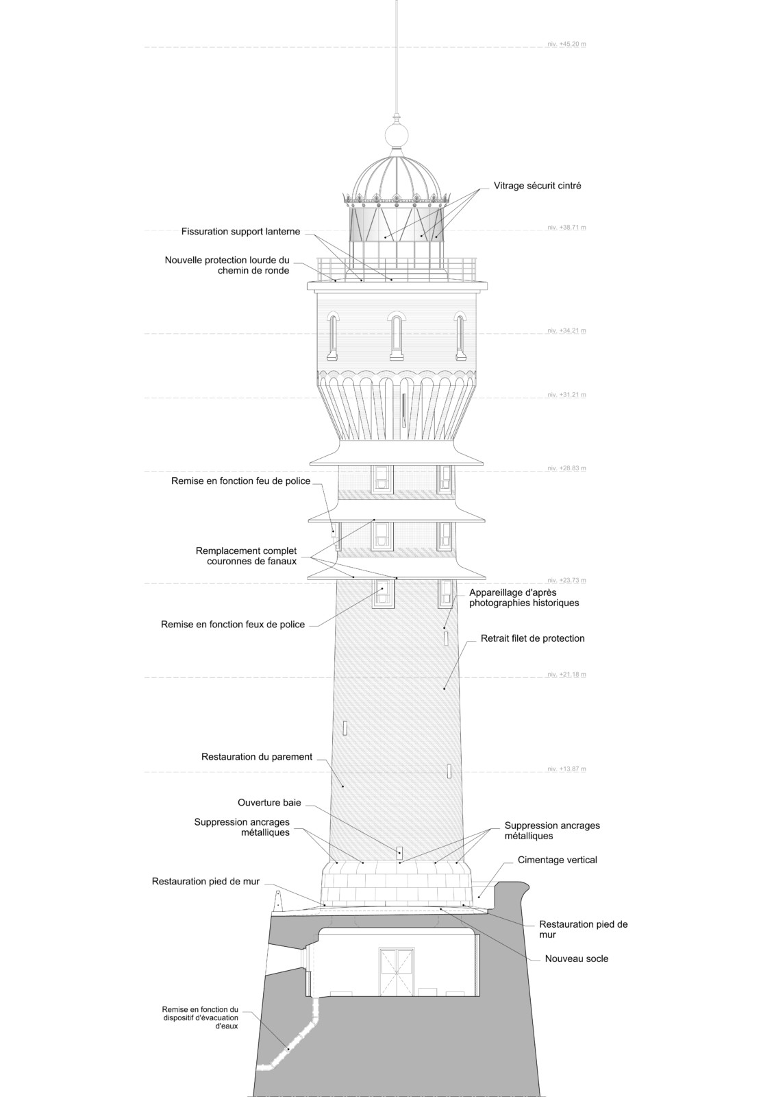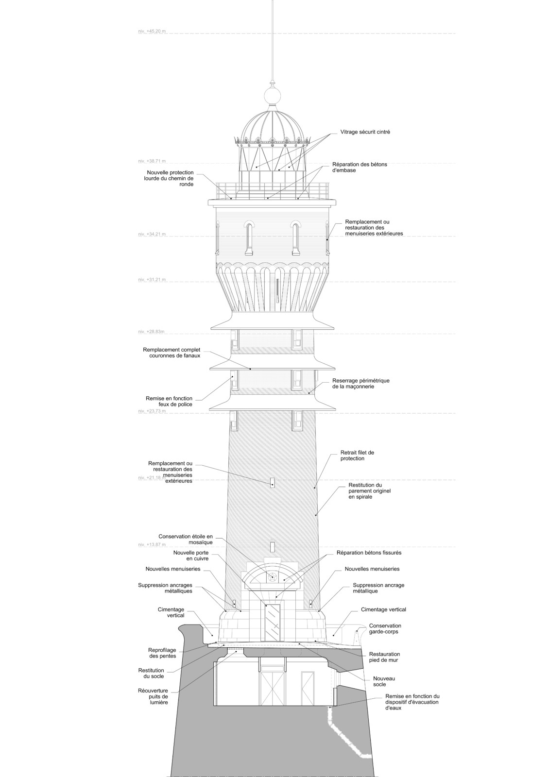 À l’extérieur, le projet prévoit notamment la suppression des ajouts tardifs altérant la compréhension de l’ouvrage (revêtement bitumineux du musoir, parement rapporté, porte métallique, vitrages en plexiglas), la restitution du parement spiralé en briques émaillées blanches sur la partie basse du fût, ainsi que la restauration ou le remplacement des couronnes de fanaux en béton. Les baies du rez-de-chaussée seront démurées afin de rétablir l’éclairage naturel et la ventilation du fût.