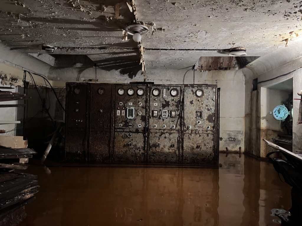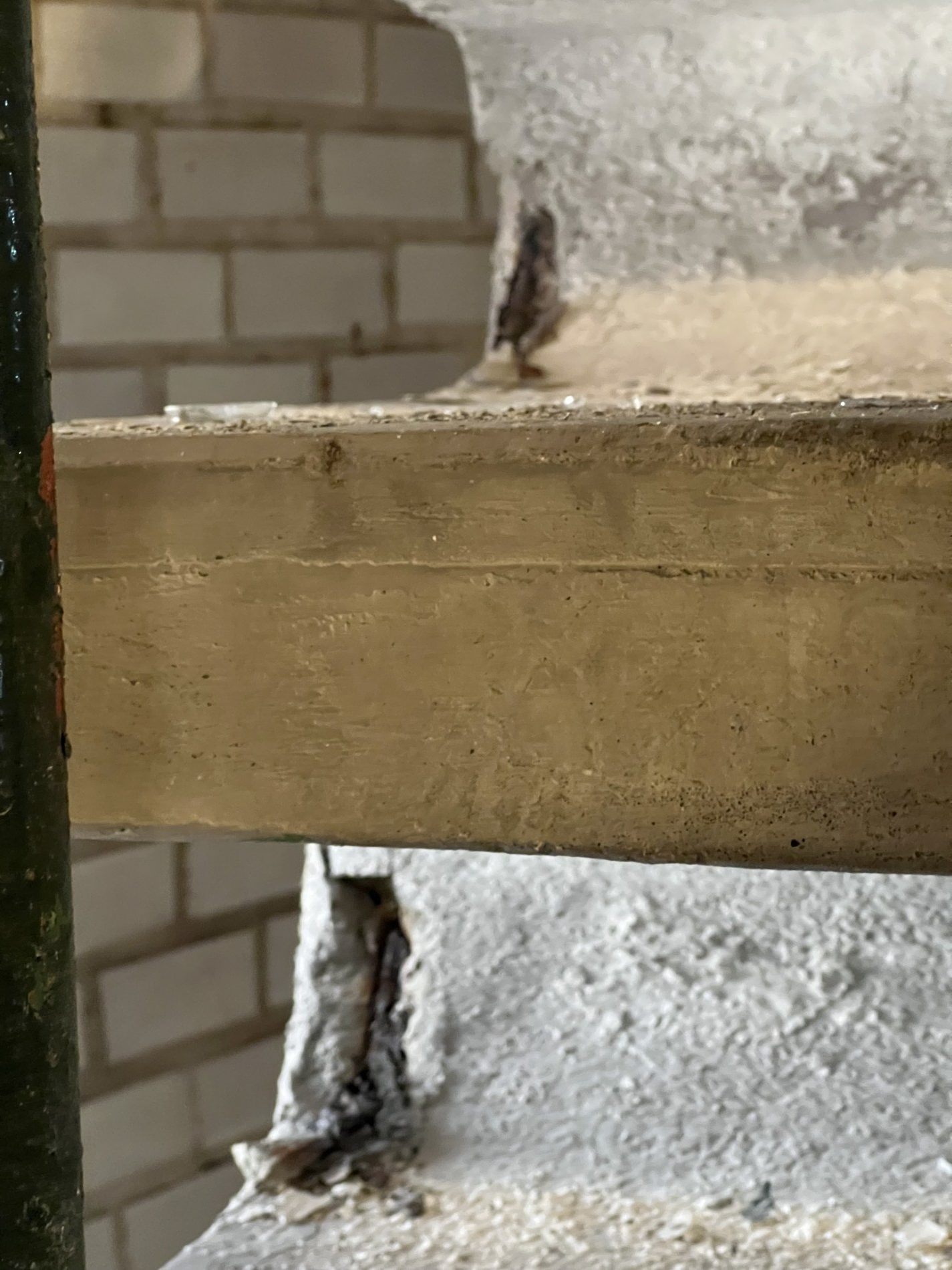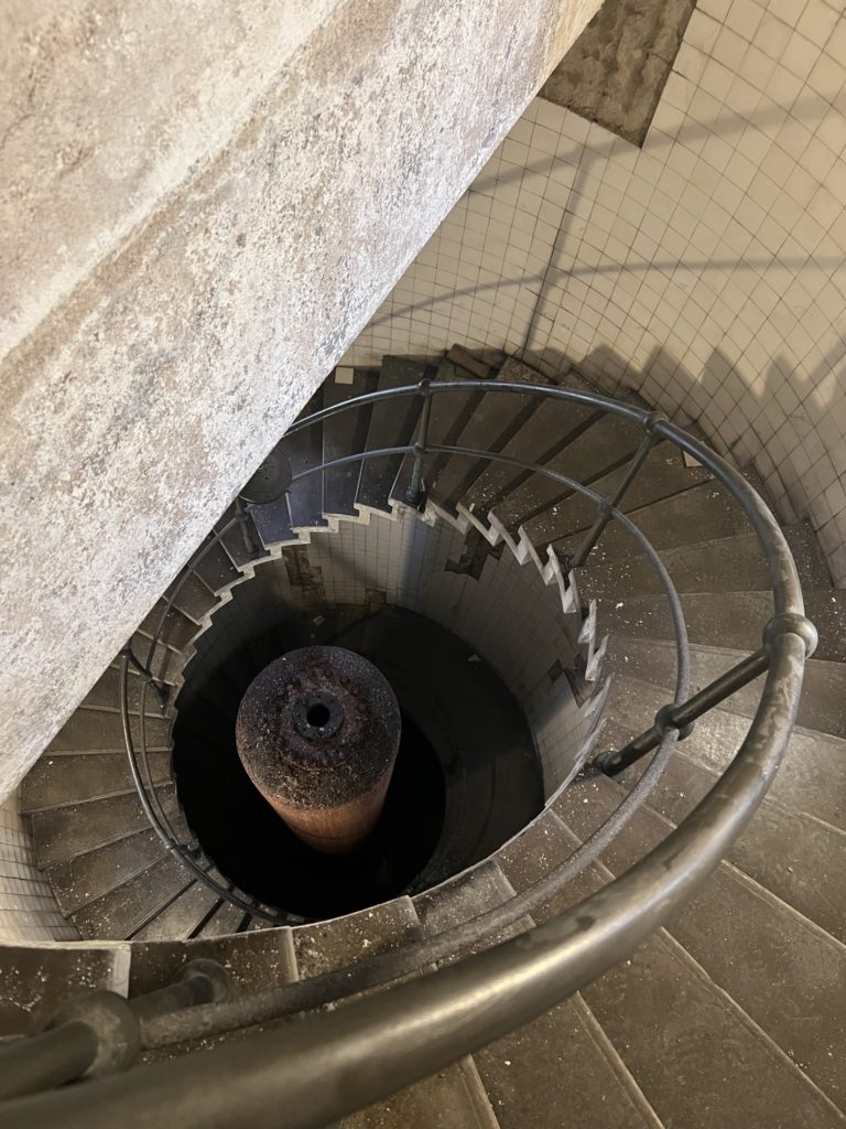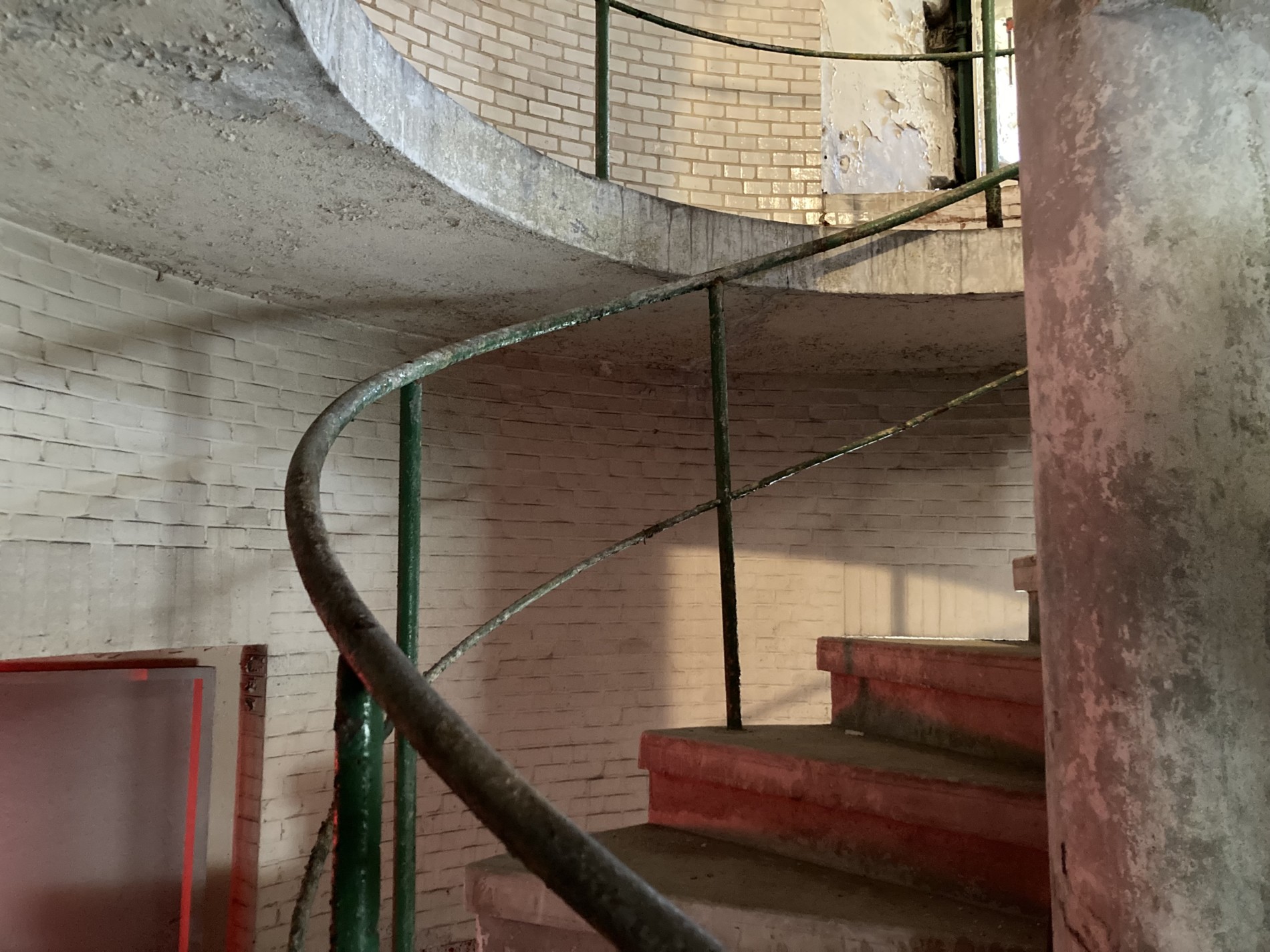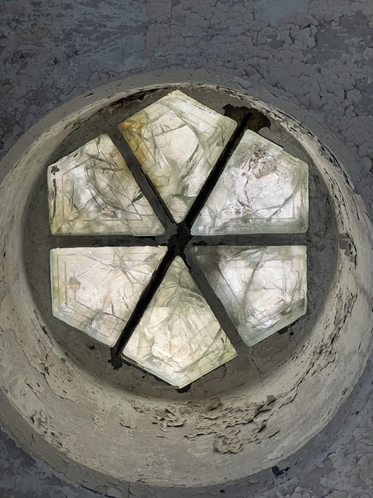 À l’intérieur, l’obstruction des baies et des puits de lumière a entraîné une mauvaise ventilation et une forte hygrométrie, provoquant la corrosion avancée des ouvrages métalliques, la dégradation des menuiseries et le décollement des parements. Plusieurs éléments d’origine ont par ailleurs disparu ou été masqués par des interventions tardives : sols en mosaïque, parements intérieurs en briques, continuité du garde-corps de l’escalier hélicoïdal.